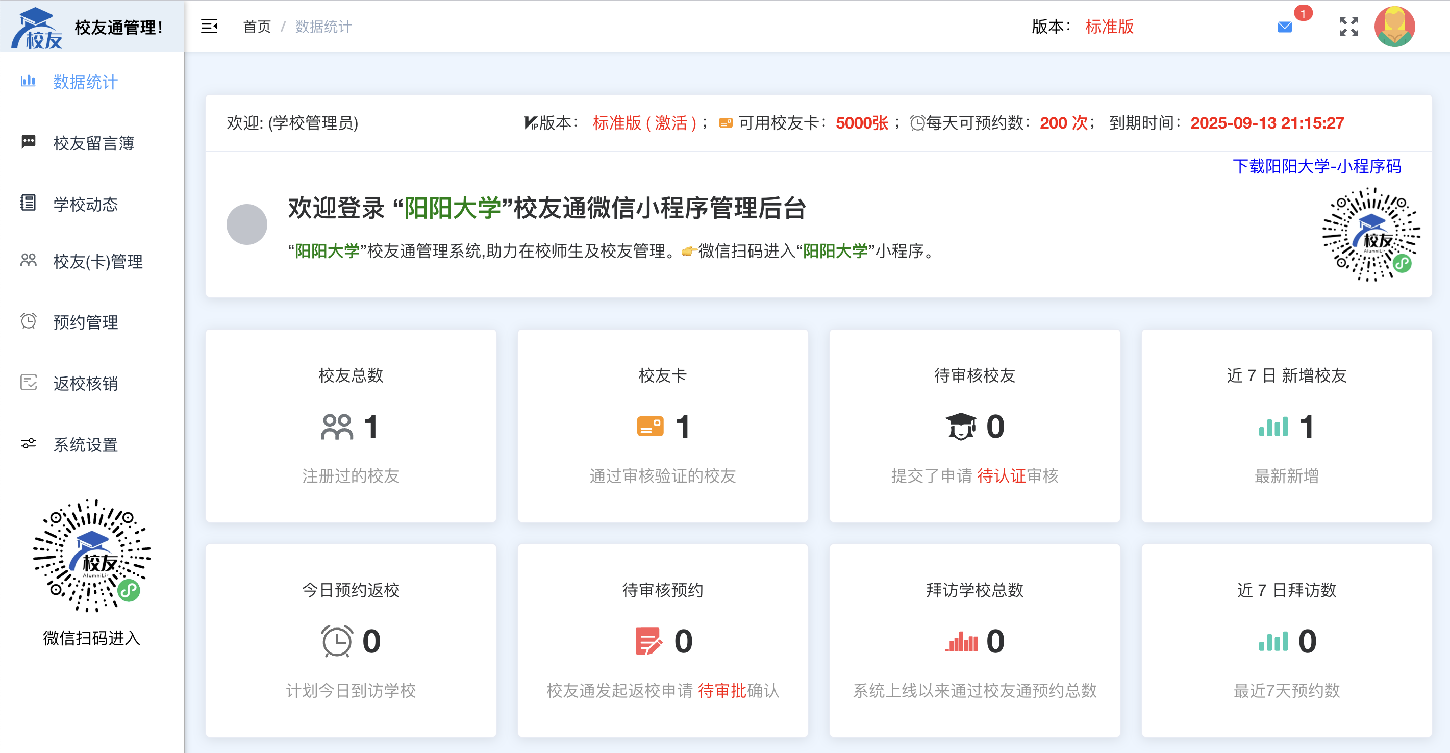 同时,提交联系后,后系统会向您的邮件发送“校友通管理后台”体验账号和密码。